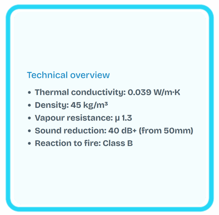 In loft spaces, it is typically installed between joists or within breathable roof structures. It is most suitable where airflow, moisture movement and overall building behaviour need to be considered alongside thermal performance.